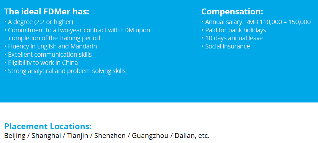 Please note that FDM is currently offering job opportunities in the FDM China Graduate Programmes. Students from all disciplines are welcomed!