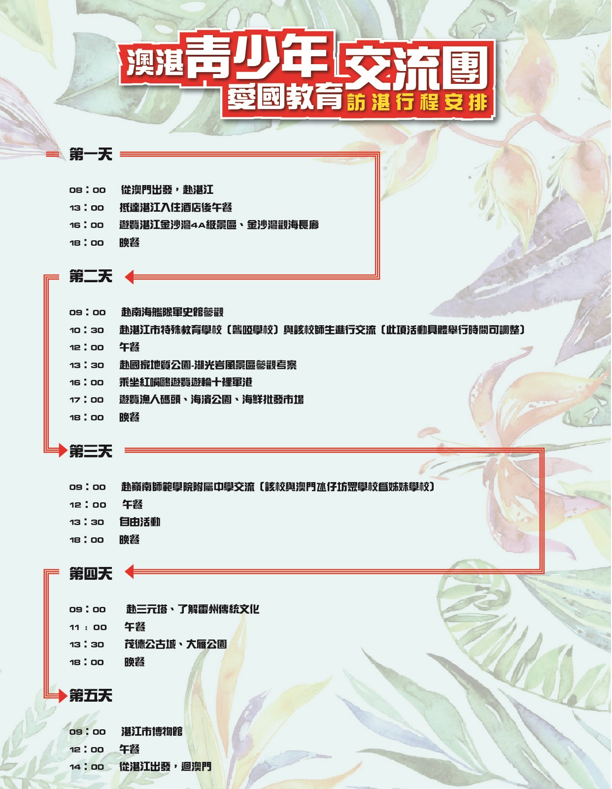 初定行程:參觀孫金沙灣觀海長廊、參觀南海艦隊軍史館、參觀湛江市特殊教育學校(聾啞學校)、參觀國家地質公園-湖光岩風景區、遊覽遊輪十裡軍港、遊覽漁人碼頭、海濱公園、海鮮批發市場等。