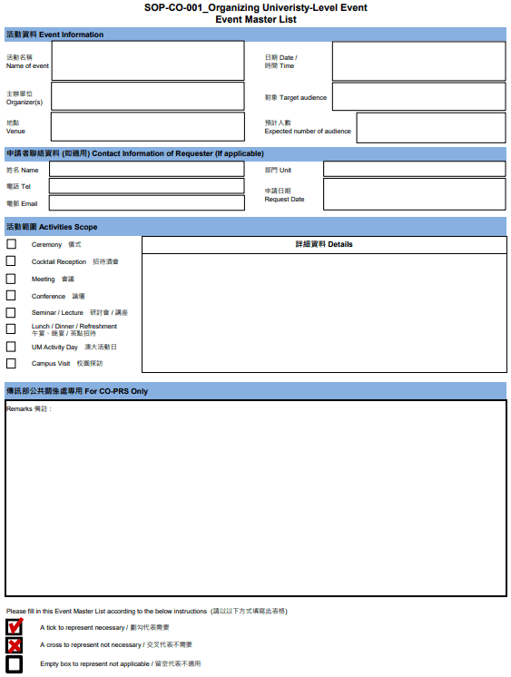 Event master list: which includes such items as ‘guest invitation & reception’, ‘general logistics’, ‘catering’, ‘media & promotion’, ‘production & souvenir’, ‘entertainment & accommodation’, ‘transportation & security’, ‘on-site checklist’, and ‘post-event follow-up’. This list can help you organize an event methodically without missing any details.